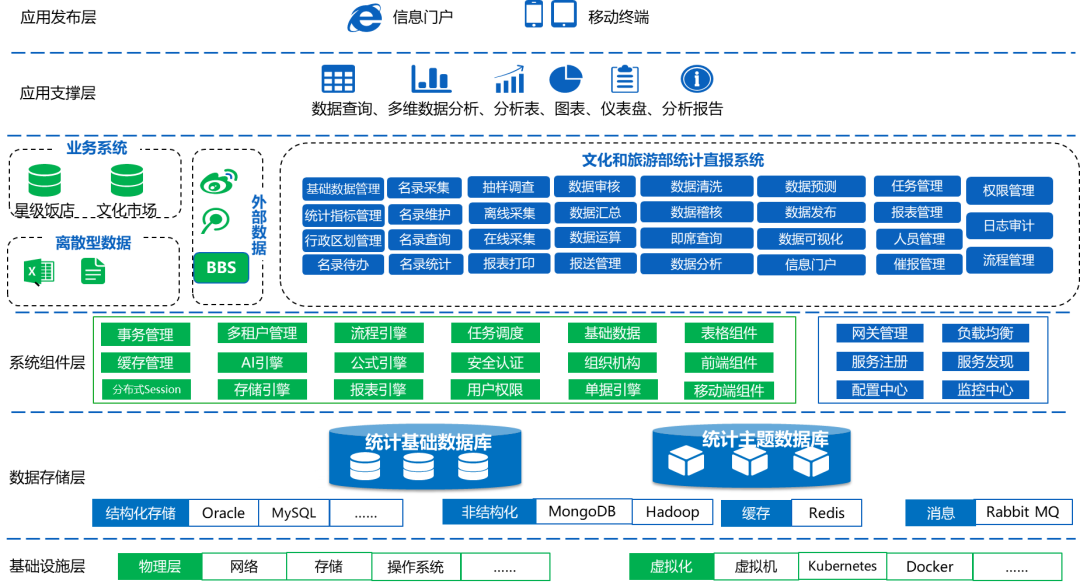 全国文化和旅游统计网上直报系统总体技术框架建立要遵循“资源共享、统一架构,业务协同”的原则,系统采用多层架构,以基础数据库和统计信息数据库为基础进行开发,实现资源和服务的共享,实现业务层和展现层的分离。总体架构如下图所示: