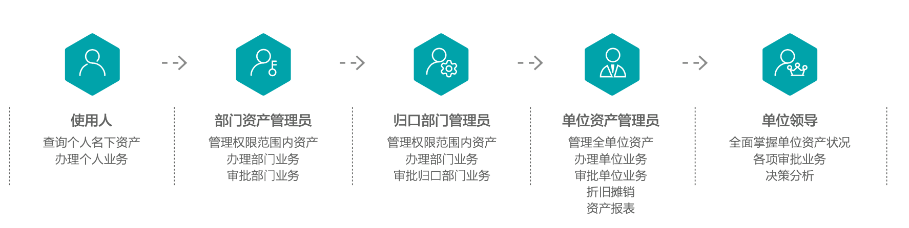 系统落实了“人人都是资产管理员”、“数据多跑路,师生少跑腿”管理理念,支持人员“多身份”、“双肩挑”场景 应用管理,实现对国有资产全覆盖和全生命周期管理,加强高校内部业务管理流程,确保资产科学配置、高效使用、规范处置。