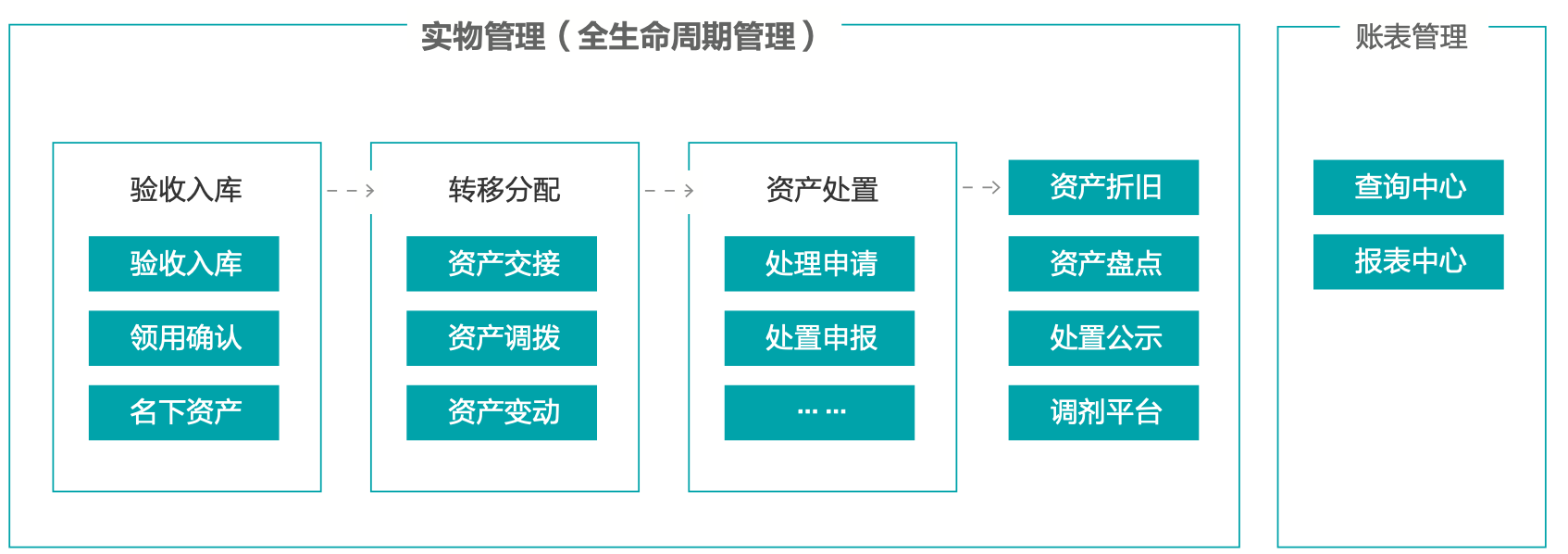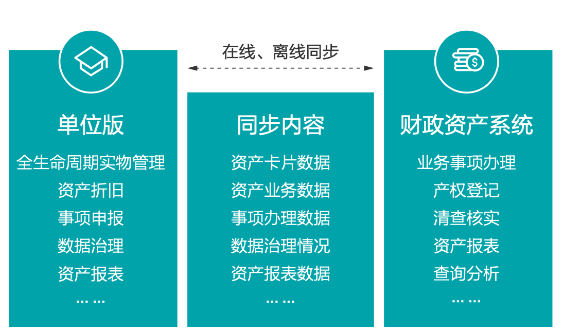 系统涵盖资产验收入库、资产财务对账、转移分配、资产调剂平台、资产盘点、资产折旧、资产出租出借、资产处置、 收益管理、查询中心、资产报表、数据体检等模块。