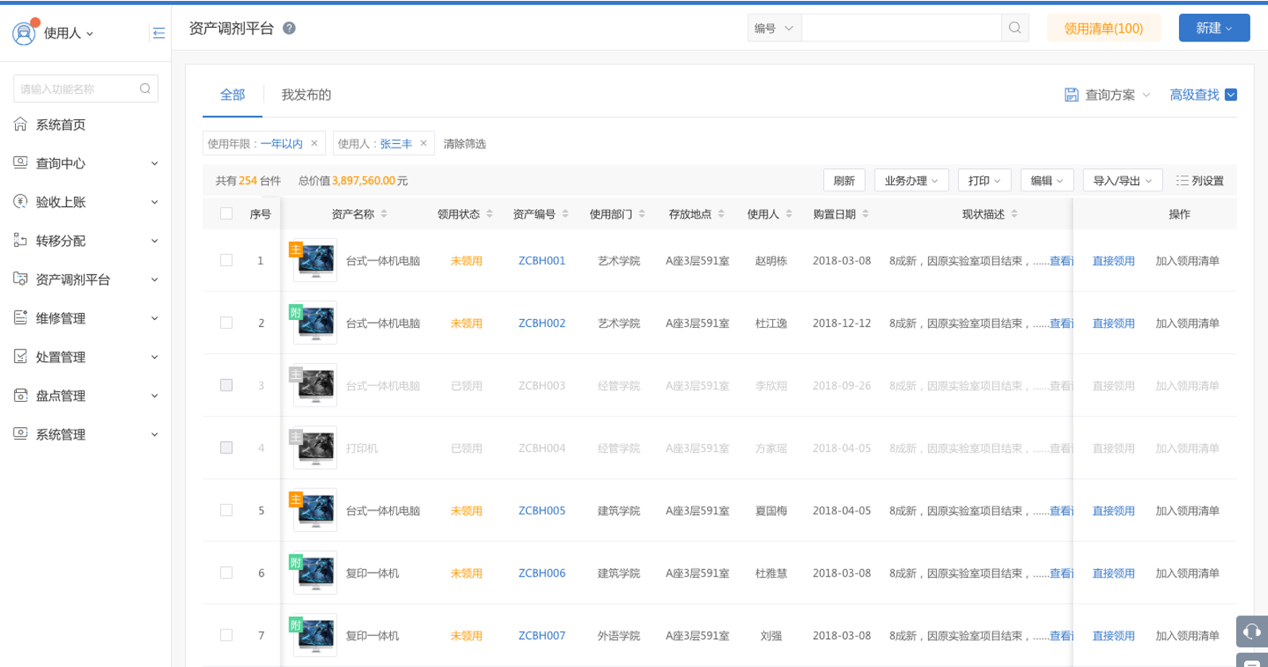 内置资产调剂平台,盘活闲置资产;提供处置公示平台,处置资产公开,提高资产使用效益。