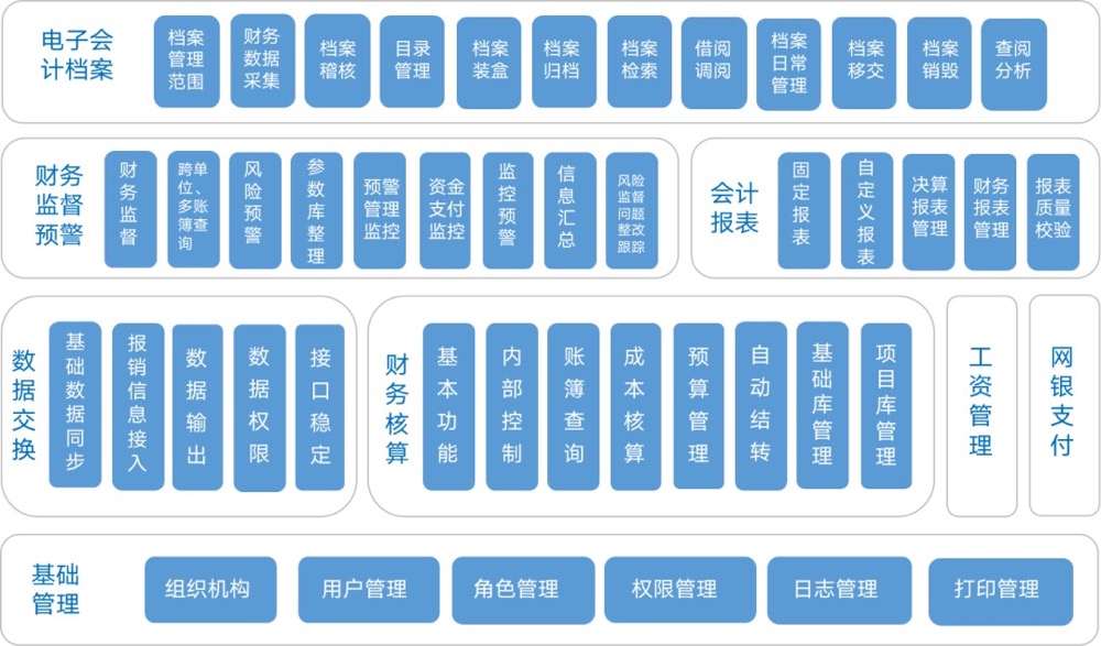 农科院财务软件系统主要包括:基础管理、财务核算、报表管理、财务监督与预警、数据交换、工资管理、网银支付、电子会计档案共八个功能模块。