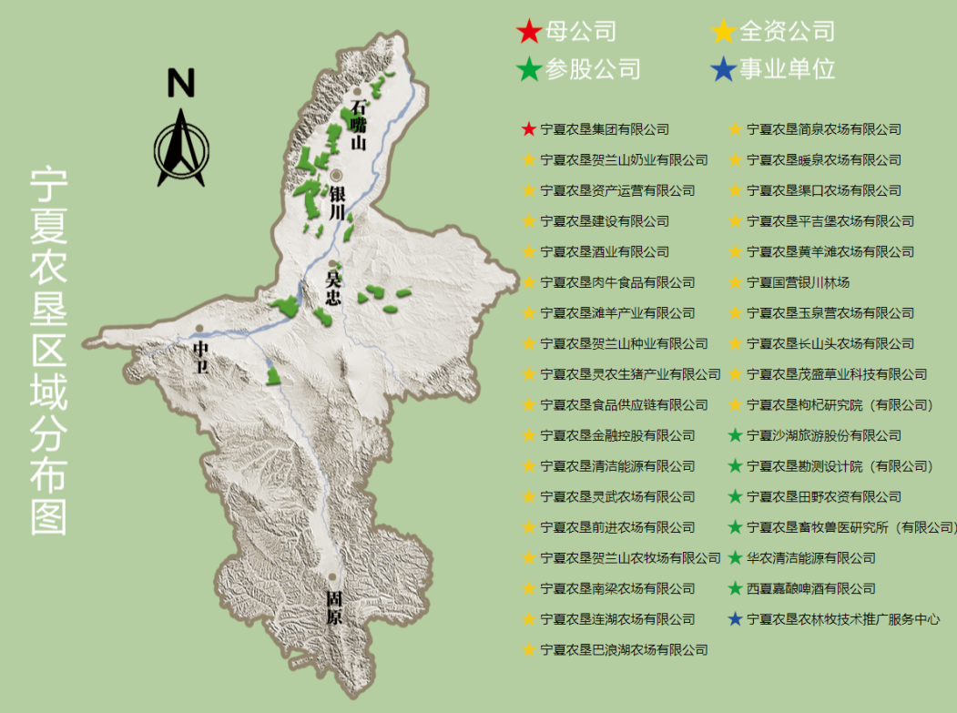 宁夏农垦集团创建于1950年,其前身是中国人民解放军农业建设第一师,经历了军垦农建师、国营农牧场、企业集团公司等不同的发展时期。经过50多个春秋,现已发展成为贸工农综合经营、一二三产业全面发展的现代化大型企业集团,是宁夏的重点骨干企业之一。现辖15个国有农、林、牧场和8个国有企业、国有控股、股份合作制企业,现有人口12万人,土地面积282万亩。