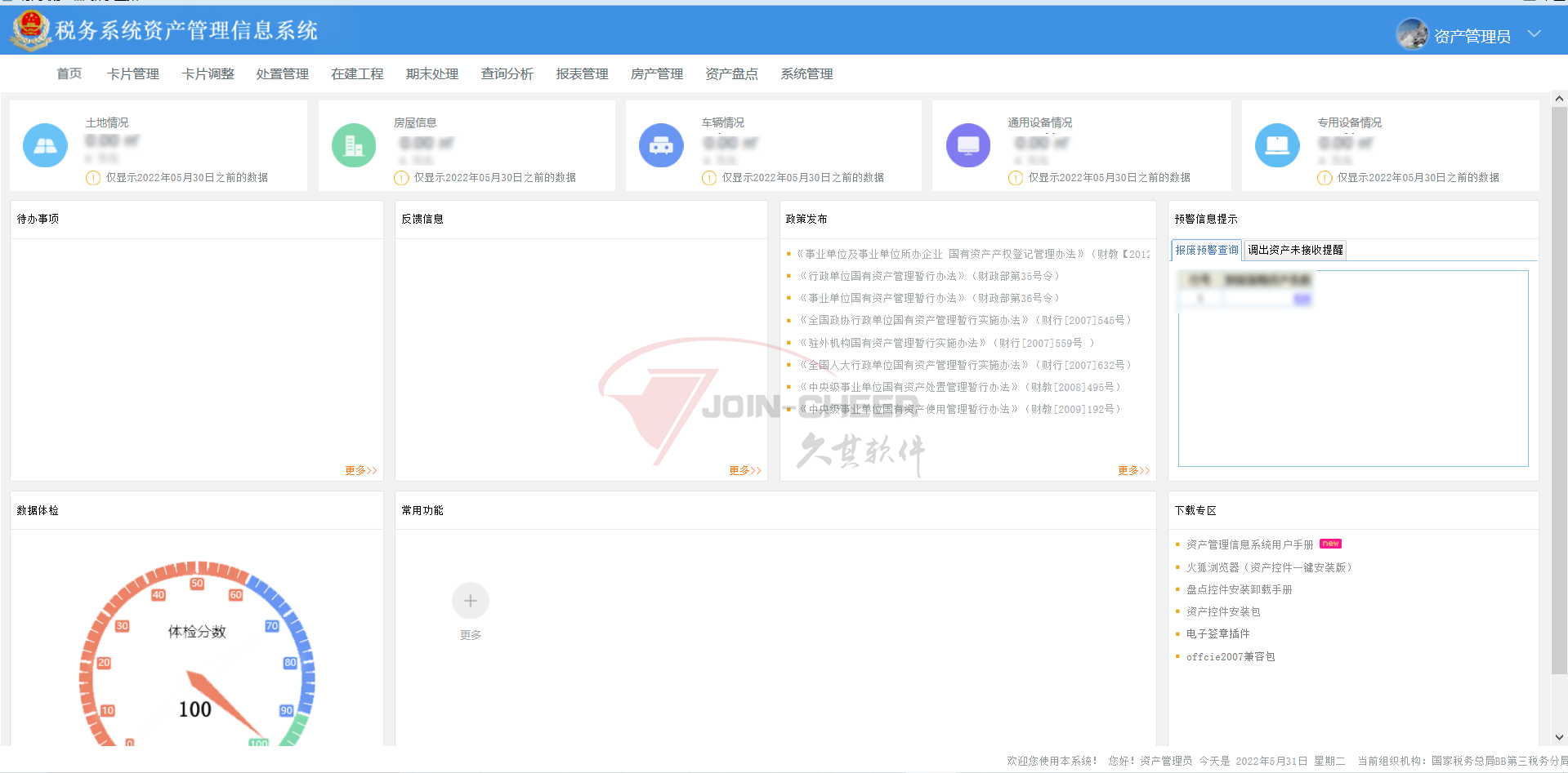 项目对国家税务总局及省局开展了分布部署,全系统包括总局、省级、地市级和县级约4000家单位。面向税务部门的资产管理平台建设了包括单位基本信息、资产卡片管理、摊销折旧管理、处置管理、使用管理、在建工程、资产清查、综合查询、资产报表等功能模块,加强了资产管理的深度和广度,打造了资产全生命周期的管理。