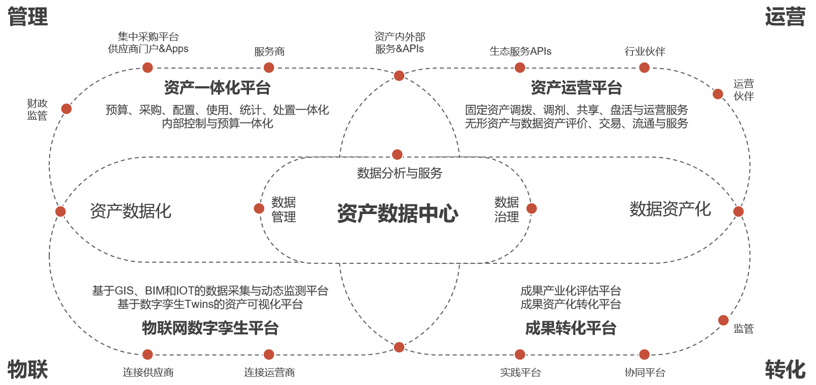 资产数字化运营平台:建设统一的资产运营服务平台, 在实现固定资产调拨、调剂、共享、盘活与资产的运营服务基础上,加强对无形资产与数据资产的评价、交易、流通与服务。