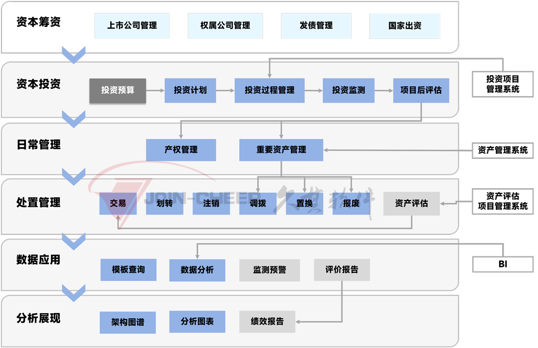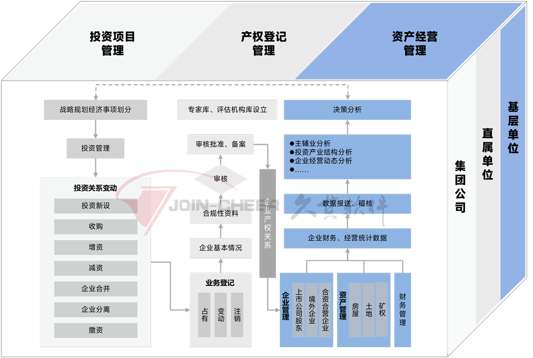 方案涵盖有股权投资管理、产权管理、产权变动审批、产权变动登记、资产管理等业务,以满足集团投资、产权、资产等运营管理的需要。