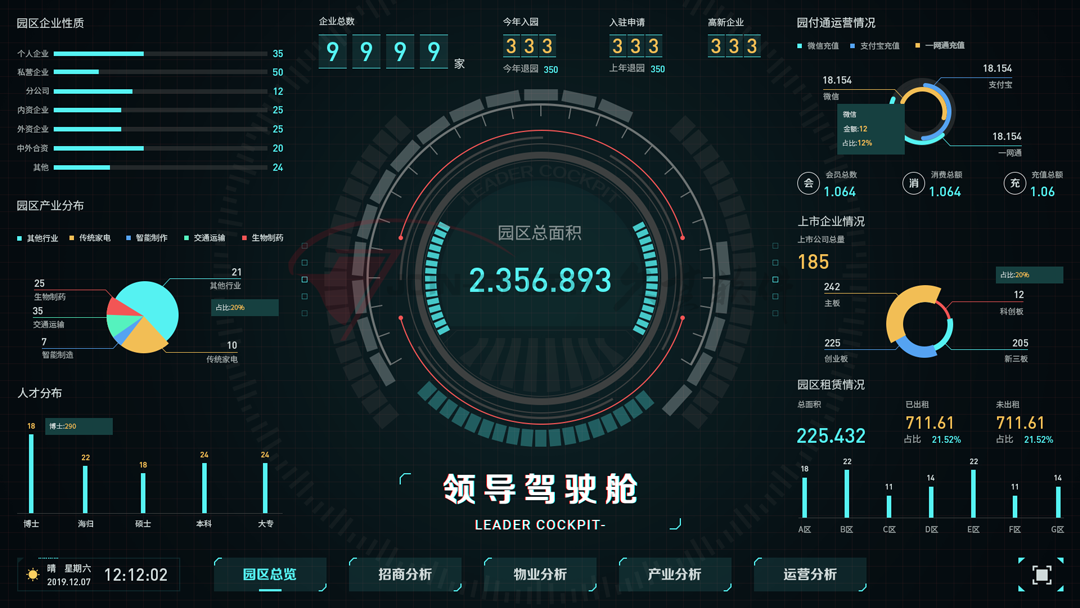 针对国有资本运营监管,PG 推出了领导驾驶舱的监管“一张图”,通过各种图表形象直观展示运营情况,满足监管者对项目态势总览、招商情况分析、产业状态分析、物业情况分析、运营状况分析、服务情况分析、安防状态分析、设备状态分析、环境实时监测、效能分析、节能减排等各方面的可视化动态监管需求。