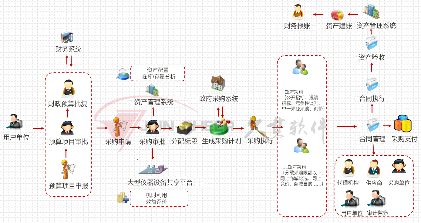 通过采购系统与预算、核算、资产等系统的衔接,实现系统间的信息共享,为采购各环节提供强有力数据支撑,提升管控水平,提高资源利用效率。