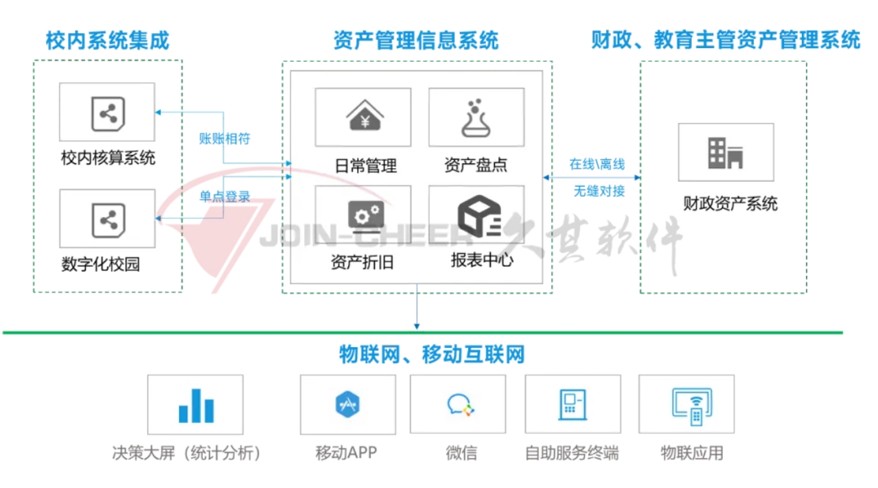 智慧资产管理系统将打通与数字化校园平台、财务核算等业务系统的数据接口,实现系统间的互联互通,提高资产数据的利用率。内置多套报表任务,满足财政部门、教育主管部门的资产监管及数据统计要求,建立统一的数据上报体系、事项审批体系,实现与上级财政、教育主管部门资产系统的无缝衔接。