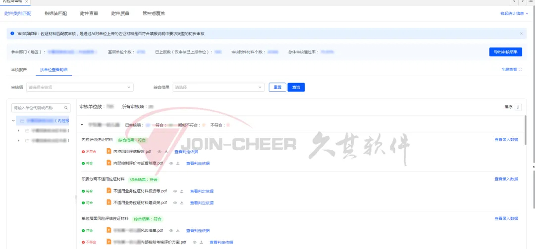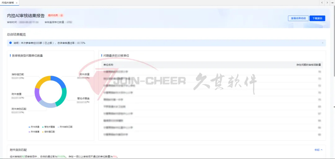 系统通过附件类型匹配、指标值匹配、附件质量审核、管控点覆盖审核、附件查重审核等场景,实现审核报告总览的自动出具。用户可以穿透到附件类型匹配明细、报告质量明细、附件重复性明细、重复对比以及管控点覆盖等环节审核结果详情,快速定位问题,进行针对性地校验和检查,全面提高了审核效率与质量。