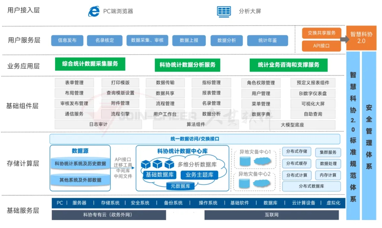项目以综合统计数据采集服务、科协统计数据分析服务、统计业务咨询和支撑服务三大核心板块作为基础,融合了业务咨询建设、数据采集、质量审计、数据汇总、数据分析利用和数据共享全链条的科协统计业务工作,通过打造一站式、专业化的统计服务能力,大幅提高科协系统统计数据质量和统计工作效率,满足统计数据联网直报、规范管理、深度分析、辅助决策和安全共享的现实需求。建设内容包括名录管理、模型设计、数据采集、数据审核、进度通报、报表生成、数据共享、数据审核、统计考核、分析挖掘、统计成果编制等二十多项功能和服务。