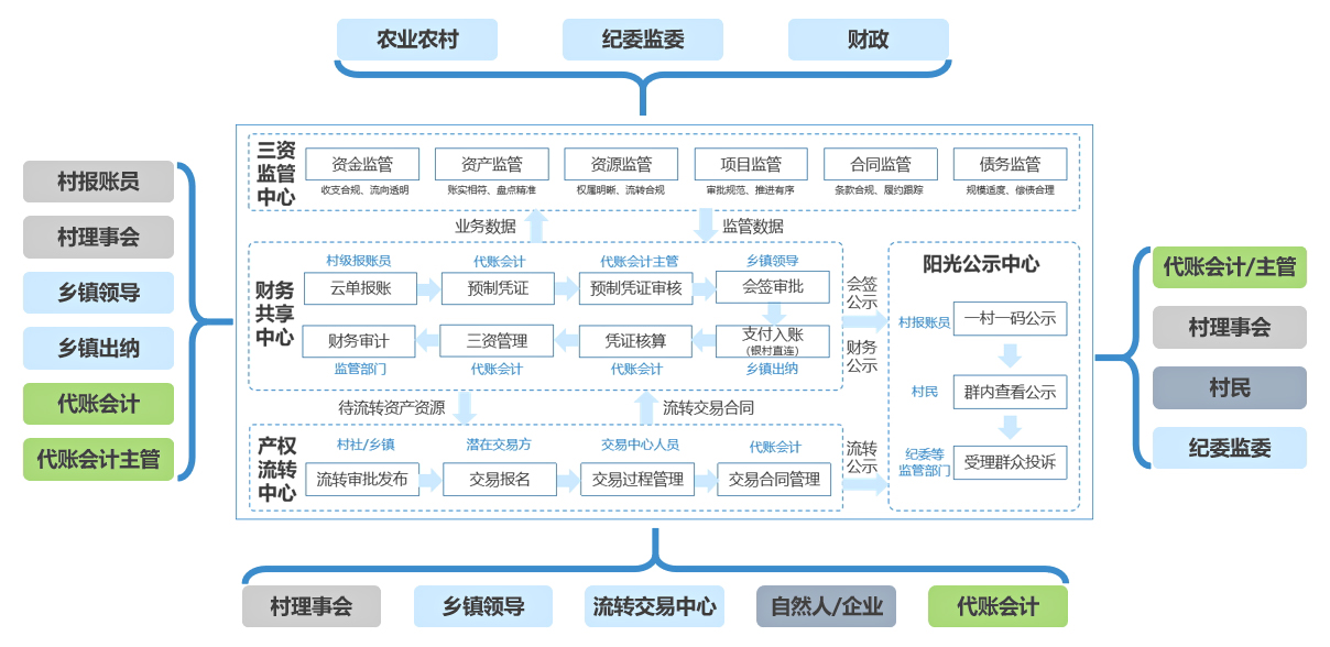 产品由“财务共享中心、产权流转中心、阳光村务中心、三资监管中心”四大中心构成: