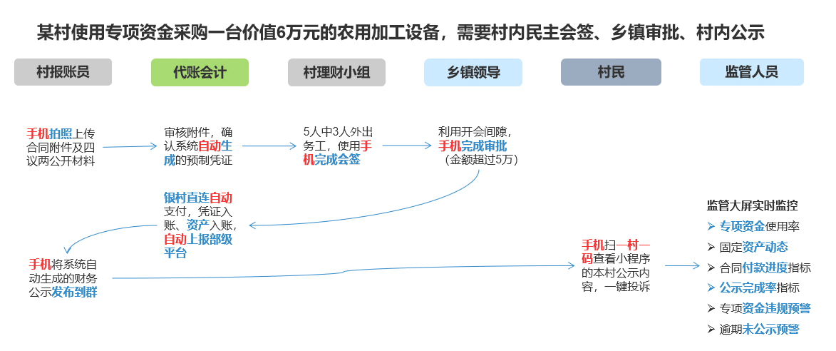 “财务共享中心”在本次升级中实现了对资金、资产、资源、合同等要素的穿透式打通,以下图中某村使用专项资金采购设备的场景为例,村报账员无需跑腿,拍照上传即可完成报账与重大事项审批申请;村理财小组、乡镇领导可以在线完成会签与审批工作;银村直连实现了资金支付的“事前审批+事中支付+事后公示、监管”;监管人员能够实时监控各项关键财务指标的合规性。