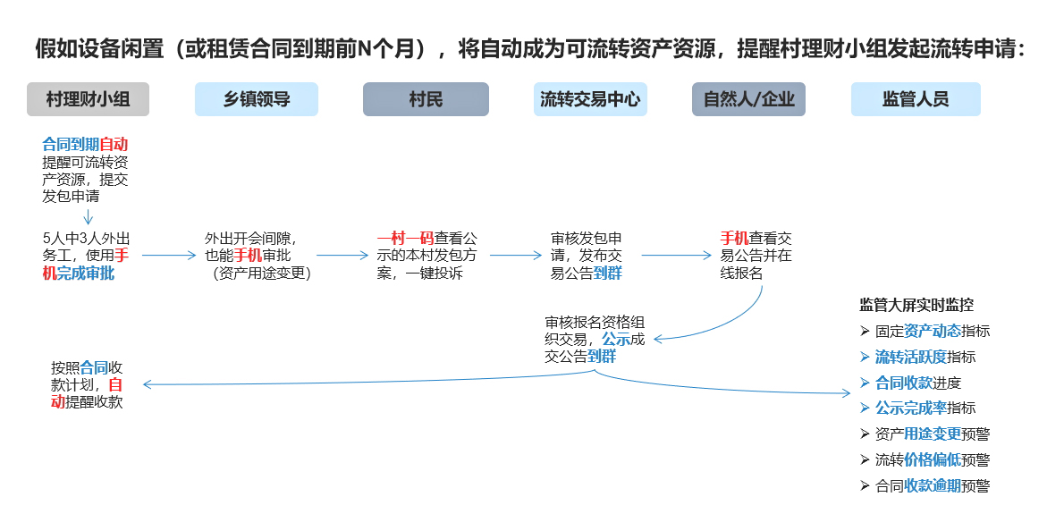 “产权流转中心”在本次升级中完成了村内民主决策流程与市县流转交易中心业务流程的整合,使得村集体资产资源从登记、流转、折旧到处置的全生命周期都纳入管控。以下图中某村的设备流转交易场景为例,当某设备处于闲置状态或以往的租赁合同即将到期,系统会自动提醒发起流转申请,经过村理财小组、乡镇领导、流转交易中心等各个审批环节,支持将交易信息转发到群,广泛触达辖区内的自然人和企业,促进交易活跃度,实现闲置资产资源的保值增值。