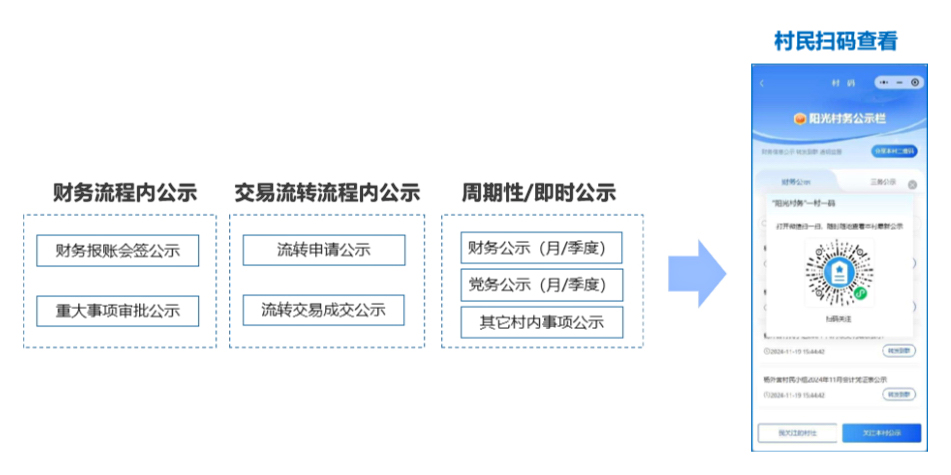 “阳光村务中心”在本次升级中将所有业务流程中的公示环节进行了统一管理,支持在报账会签、重大事项审批、交易申请、成交公告等流程中自动生成公示内容、形成待转发任务,解决了各类公示环节与业务流程容易脱节、不易监督的难题;村集体成员无需注册登录小程序,基于一村一码,扫码即可查看本村的公示内容,一键投诉到纪委;监管人员随时可以查看每个村的公示执行情况,进行及时的提醒与考核。