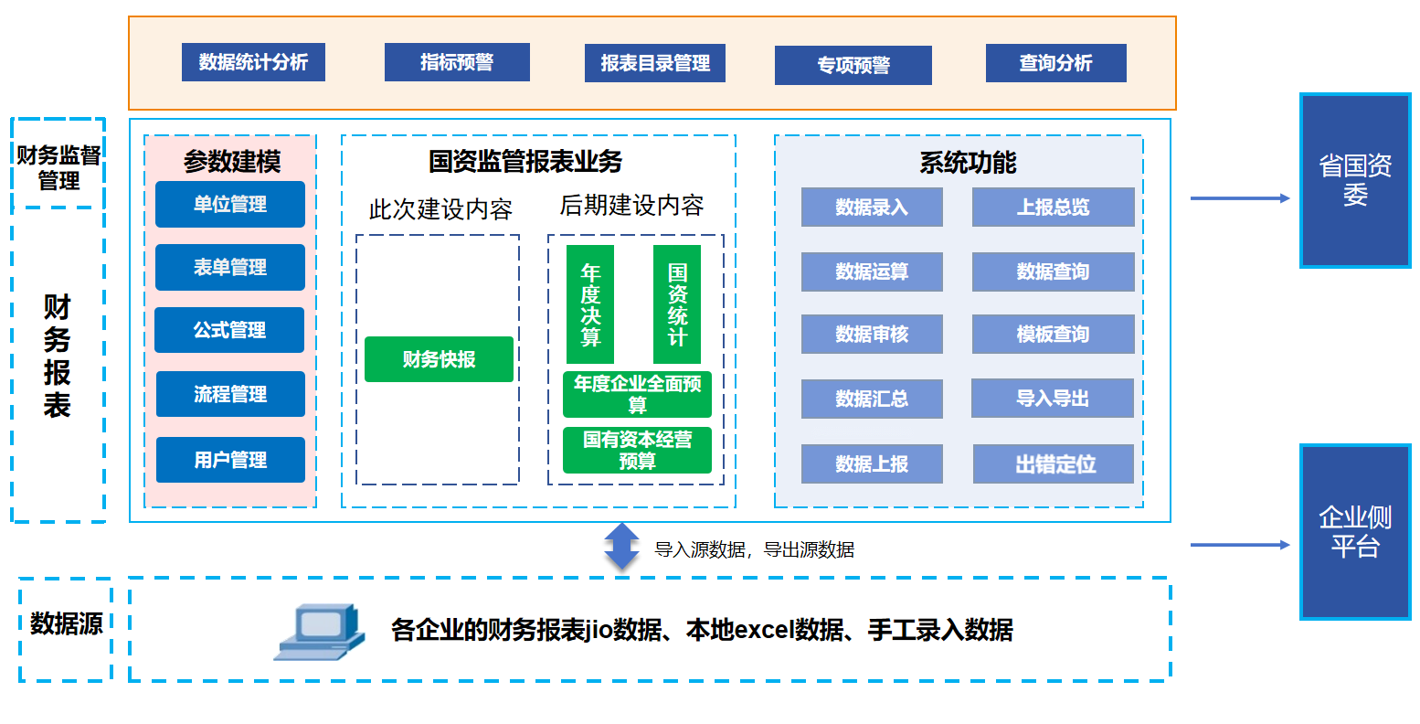 建设功能完整、统一访问的国资委国资监管财务报表平台。国资委监管财务报表管理工作平台业务主要包括企业财务快报业务,能够完整的提供财务快报报表收集所需的功能:包括报表工作布置、数据采集、运算、审核、上报、汇总、查询、分析、打印和导出等功能。所有有权限的财务快报工作人员都可以访问国资委国资监管财务报表管理系统,使用系统提供的功能完成财务快报的收集上报工作。
