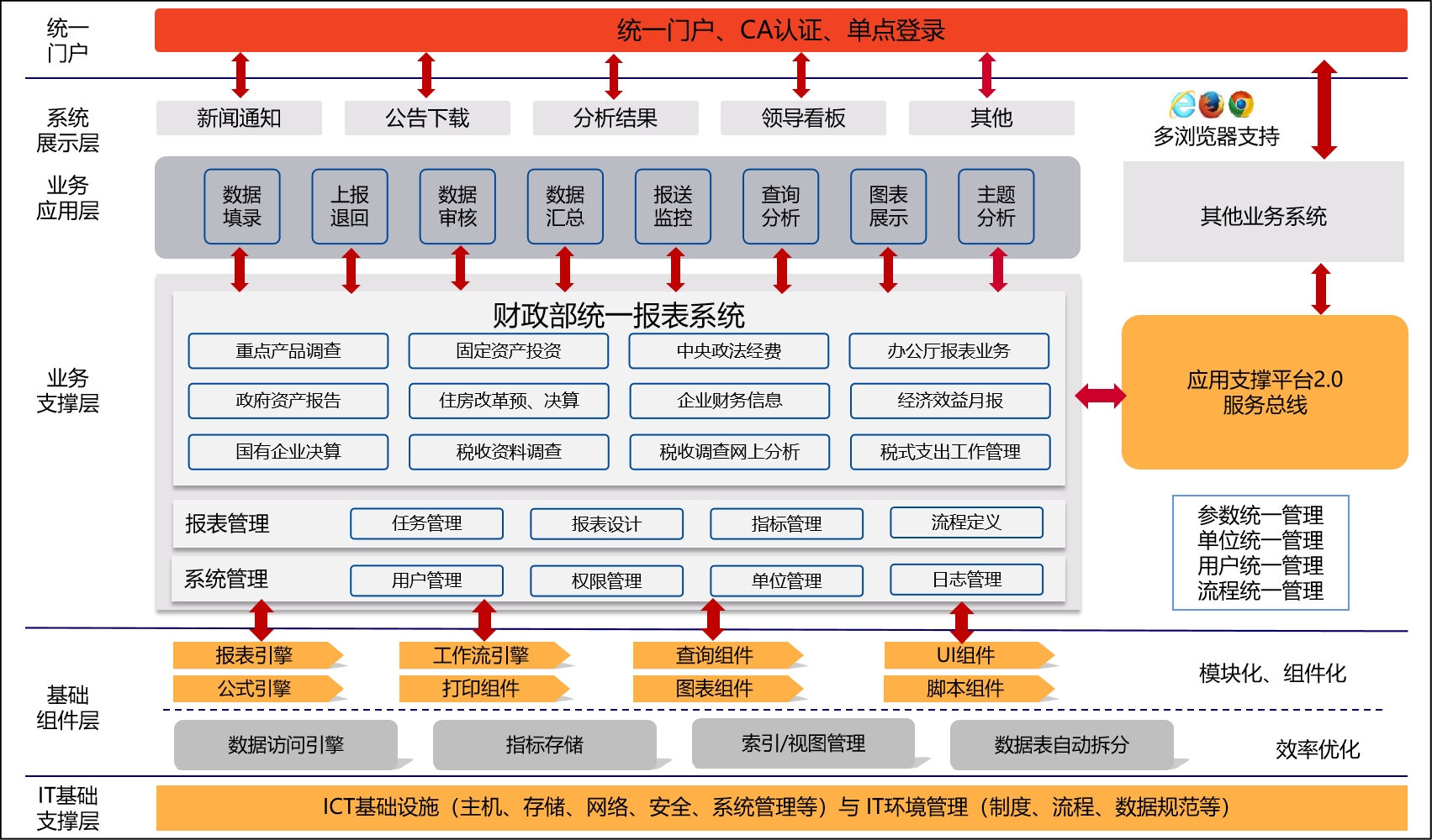统一报表符合财政一体化总体设计,采用组件化模式开发构建,具备提供报表组件、报表服务的技术条件,构建集报表展示和报表业务的一体化平台,为各类财政信息化系统提供基础报表服务。系统以实用、通用、易用为设计理念,结合多年来的财政报表实践,在系统内构成了从指标设计、报表设计到数据分析的完整业务链闭环。报表系统的整合归并,为报表业务间的业务衔接和数据共享提供了技术基础,同时统一报表作为一个整体与核心业务做衔接和数据共享。