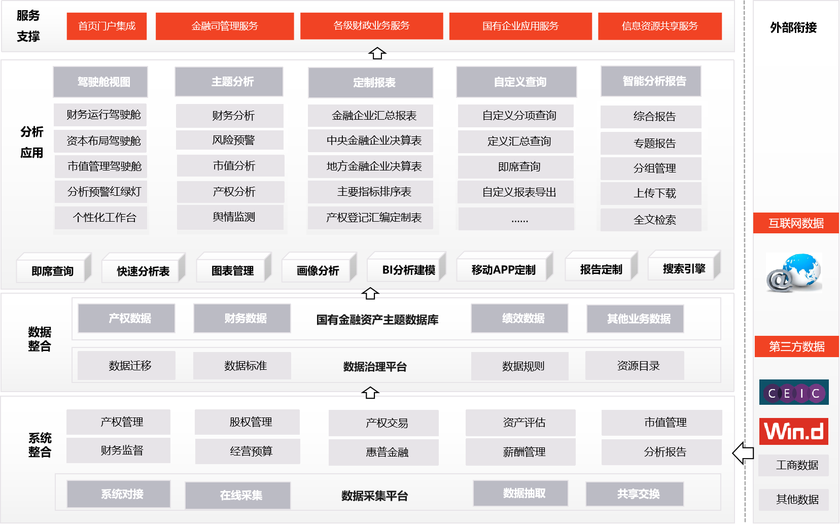 从数据采集、业务管理、研究分析、风险监测等方面,全面提升国有金融资本管理效率。降低金融企业数据报送成本,实现“每一个数据只报一次”的效率提升;推进国有金融资本集中统一管理,尽可能实现“每一个业务都可线上办理”;加快信息系统互联互通,推动中央财政和地方财政、财政部门和金融企业之间实时动态共享数据,确保中央财政“每一个情况变化都能第一时间掌握”;打破“信息孤岛”现象,通过业务管理融合和数据信息整合,形成统一、全面、综合的数据库,并通过数据挖掘、智能分析、风险预警等功能,为国有金融资本管理科学决策提供“一站式支撑服务”。