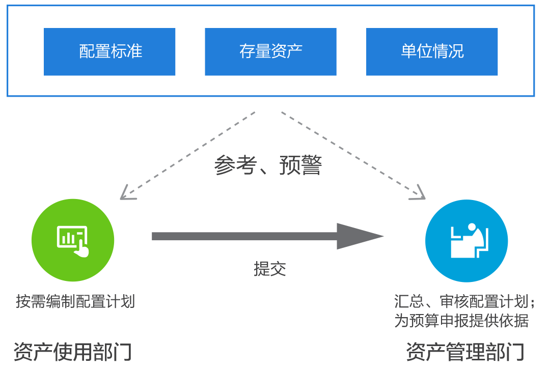 单位版增加资产配置管理功能,内置配置标准,结合存量资产及单位信息自动计算待报废资产情况、智慧预警超标申请,辅助科学审批。以存量控增量,严把资产入口关,实现申请、采购、配发各环节前后衔接、环环相扣。