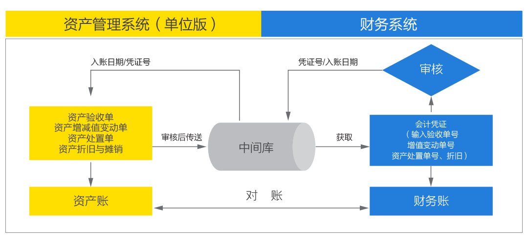 单位版提供与财务系统衔接的全面解决方案,提供强大的对账功能,对每一笔资产业务明确财务记账方式,解决资产账和财务账对账难、不一致的问题,降低资产管理部门与财务部门之间的沟通成本。同时可实现系统间数据的实时交互,保证资产与财务的账账相符,资产与实物的账实相符。