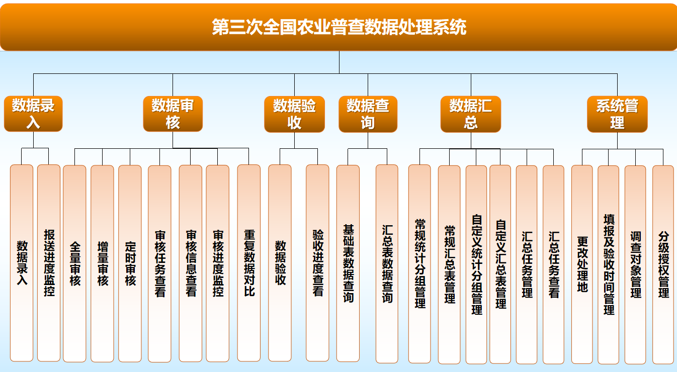 第三次全国农业普查是一项重大国情、国力调查。它是按照国家规定的统一方法、统一时间、统一表式和统一内容,主要采取普查人员访问登记的办法,全面收集农村、农业和农民有关情况,为研究制定农村经济社会发展规划和新农村建设政策提供依据,为农业生产经营者和社会公众提供统计信息服务。第三次全国农业普查既是对“十二五”时期“三农”发展成果的检验,又是“十三五”规划开启的基础,对我国全面建成小康社会、推进农业现代化、打赢脱贫攻坚战有十分重要的意义。为保障第三次全国农业普查工作的顺利实施,确保国家及省、市、县各级统计机构高效地完成三农普数据处理工作,国家统计局建设第三次全国农业普查数据处理系统。