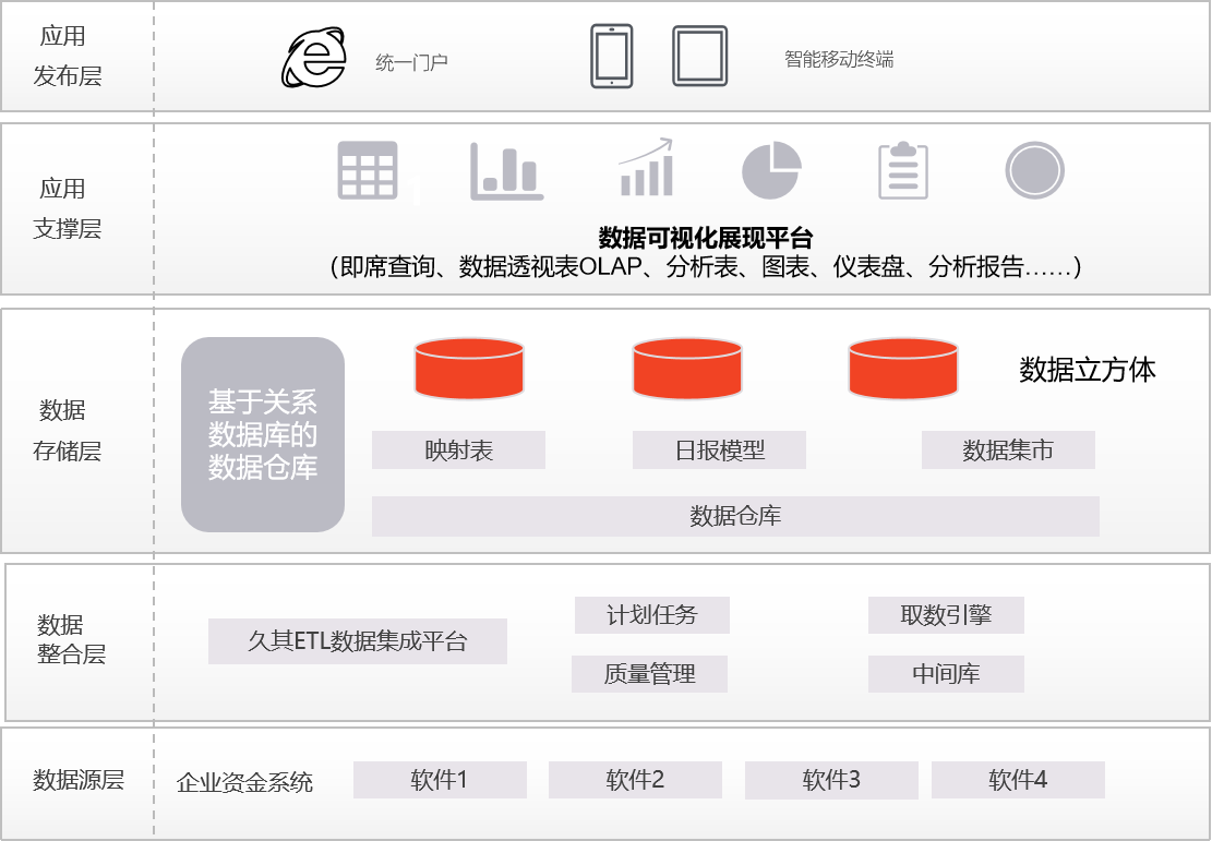 系统配置模块:组织机构管理、用户权限管理、系统功能配置、业务方案管理、报表管理、指标管理、基础数据管理、数据建模管理、ETL控制流管理。
