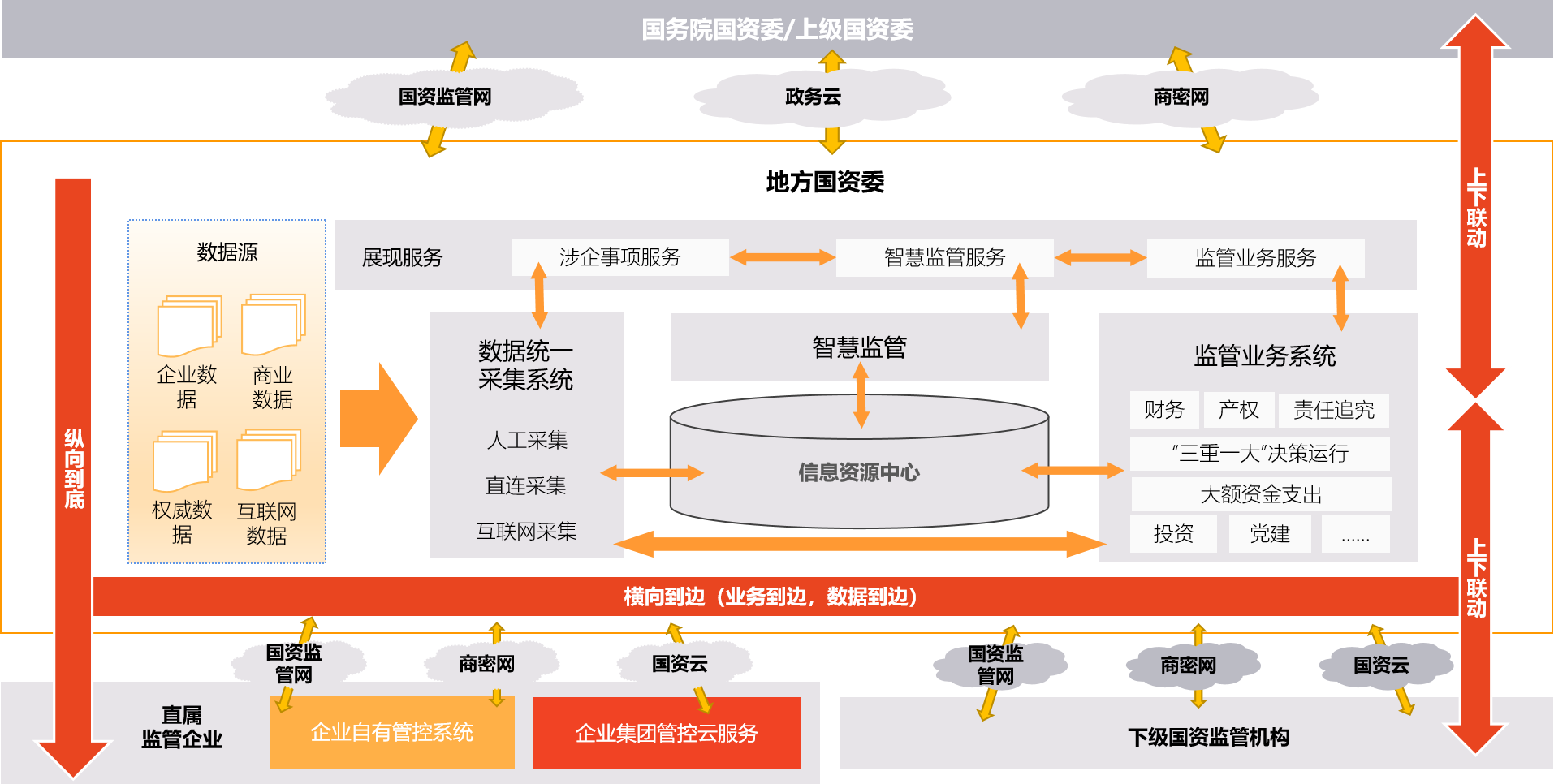 围绕“履行出资人职责”的监管核心,搭建国资国企在线监管平台,建设统一数据采集平台,通过实时数据抽取、在线填报、网络爬取、政务信息交换等多种方式,实现国资监管的数据同源、实时监控、交叉验证,提高监管的实时性、有效性,构建国资国企信息化监管数据中心、建设覆盖系统内各监管企业的信息化应用系统,着重开展“三重一大”决策运行、大额资金支出动态监测、财务、产权、投资、责任追究、党建等核心业务应用建设,促进形成上下联动的信息化监管格局,实现国有企业业务流、信息流、资金流的全程、实时、网络化监管,实现对国有资本存量、增量以及国有经济运行态势的动态分析,建立横向到边、纵向到底的信息化监管体系并持续发挥作用。