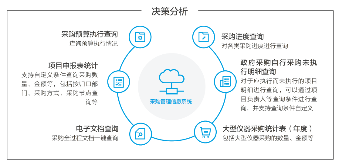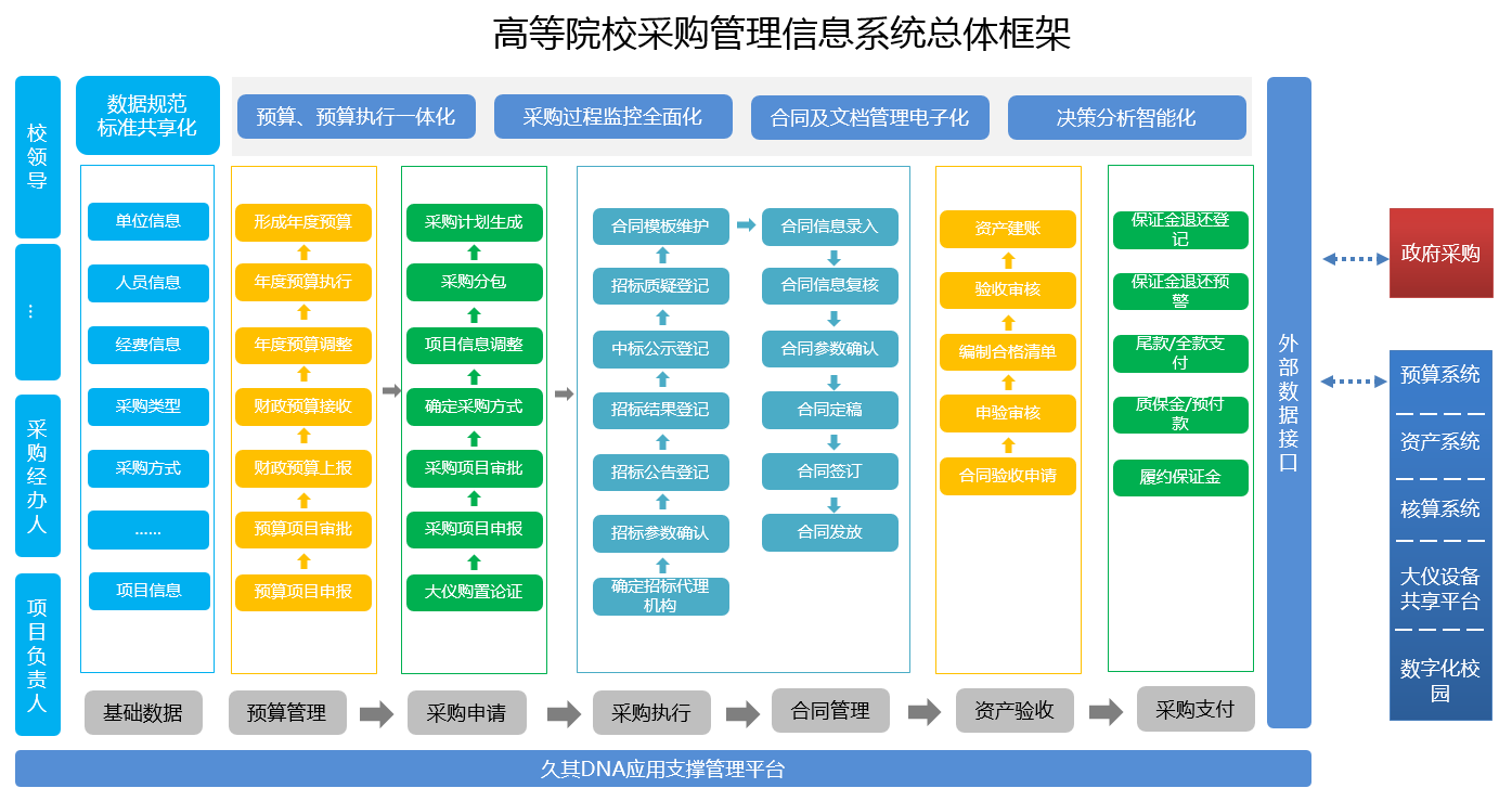 通过采购系统与预算、核算、资产等系统的衔接,实现系统间的信息共享,为采购各环节提供强有力数据支撑,提高管控水平,提高资源有效利用。