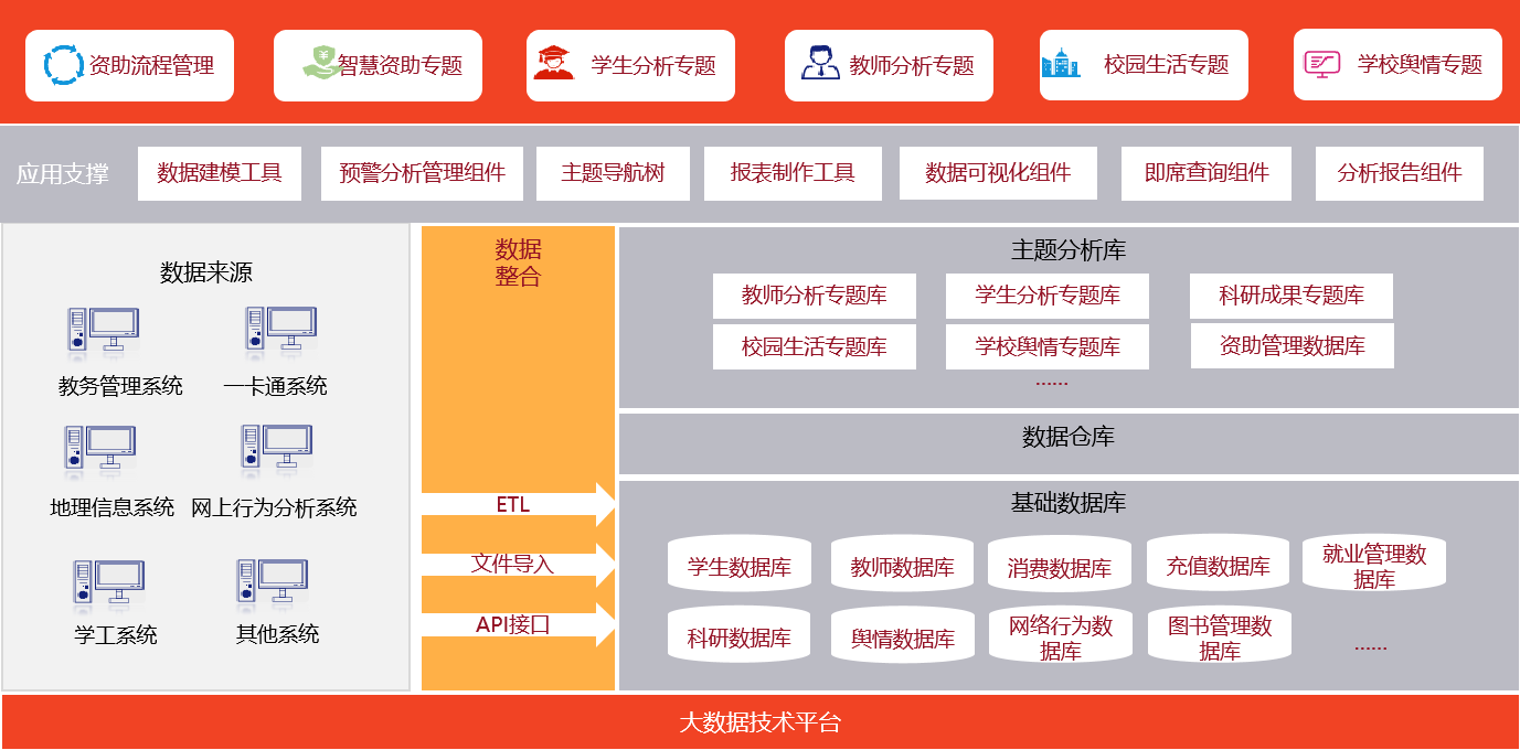 数据资源层包含对内部数据和外部数据的采集,内部数据包括一卡通消费数据、一卡通充值数据、教务管理系统数据、校内网上行为数据,外部数据包括从省级平台共享数据、互联网抓取数据、其他外部平台数据(扶贫、教育相关外部系统)等。