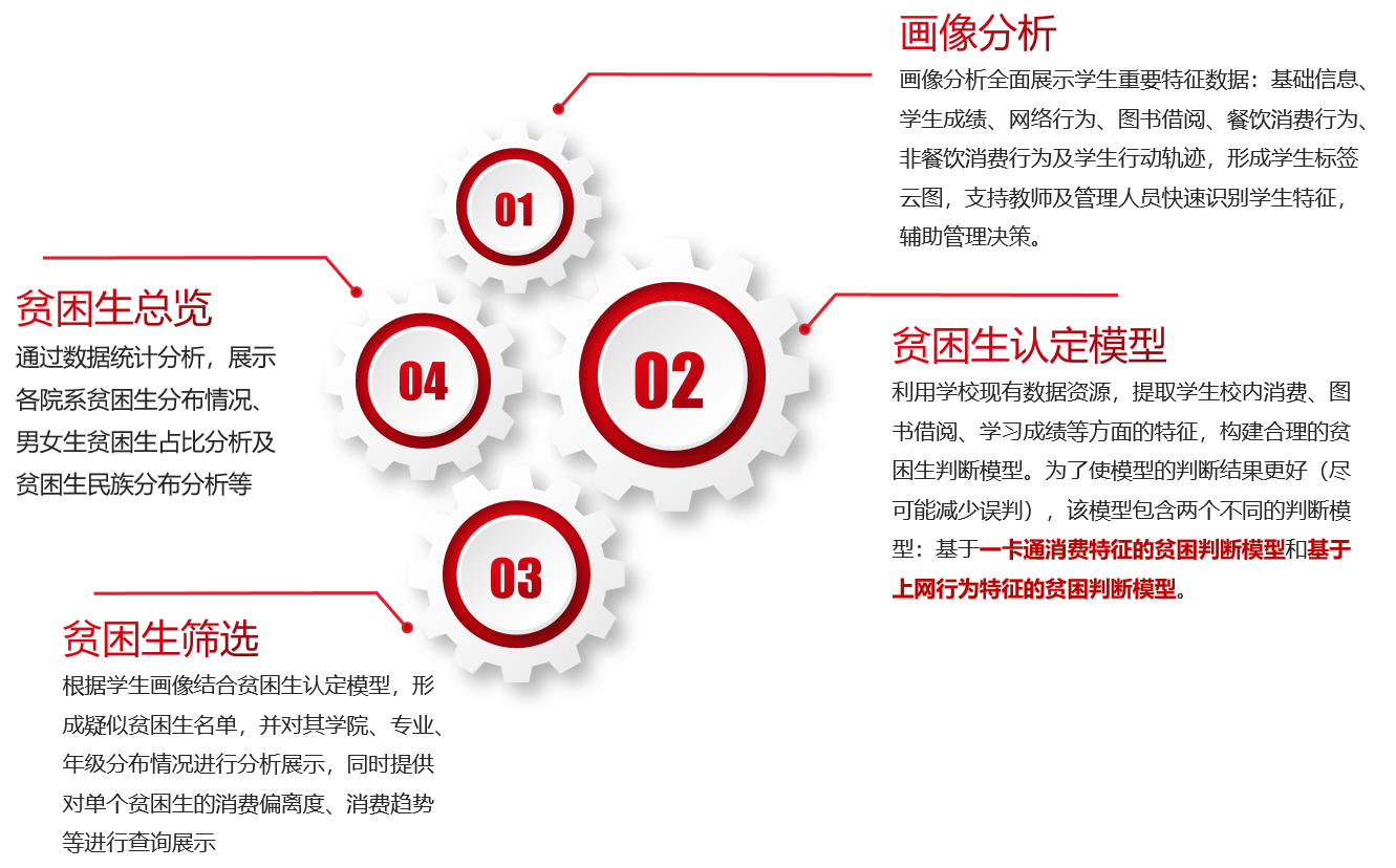 建设大数据分析平台,建设学生综合画像、数据挖掘模型,实现对贫困生精准认定、精准资助、精准服务。