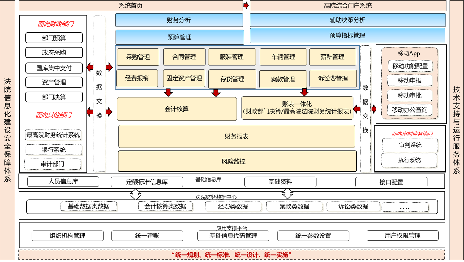 以“一体”为导向,实现法院保障运行管理新机制各环节之间控制与信息的精准对接;以同一数据源、统一数据标准、统一技术框架”为原则,遵循“整合资源,信息共享”、“统一架构,业务协同”,采用多层架构,构建以法院保障财务业务资源全面提升保障服务水平为目标,以基础数据为基础,以预算管理为主线、资金管控为核心,以预算、收支、采购、资产、工资、会计核算、部门决算、报表管理、财务监控等全过程管理为主线,以风险控制为手段,实现预算管理、项目库管理、采购管理、合同管理、资产管理、经费报销、会计核算的互联互通,打通与法院案款诉讼费业务系统数据交互,强化业务与财务数据一致性、关联性,实现数据共享协同。