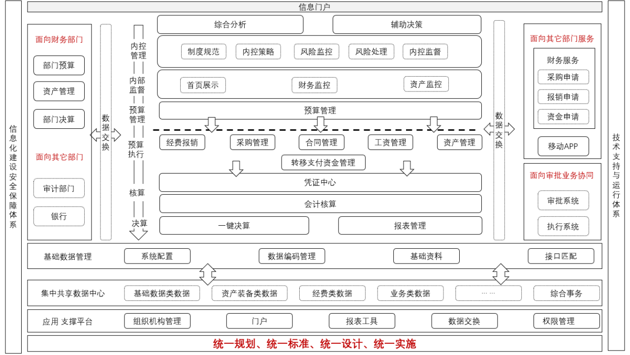 构建司法行业财务信息化标准规范,参照财政部颁发的《财政业务基础数据规范》要求梳理与财政相关业务,并结合司法行业业务特点进行综合分析和归纳,形成完整的司法行业财务管理基础数据,构建标准规范体系,建立统一的电子化信息系统数据标准、交换规范,为各应用系统的整合与建设、数据安全、信息共享打下坚实的基础,力求司法行业财务信息资源标准化、体系化,以便规范指导单位各级单位财务信息化建设。